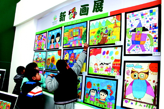 2014年的最后一天,济南市民生大街小学、燕柳小学、宝华小学等众多学校各出妙招,迎接新年。有的举行狂欢节,有的上演校园吉尼斯大赛,有的举行画展,对新一年的期待不言而喻。图为宝华小学为全体学生举行新年画展。