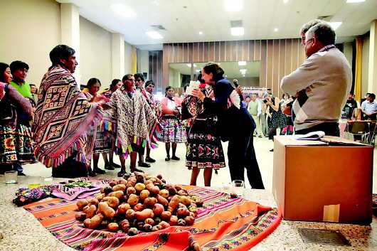 在一场庆祝土豆品种交流的仪式上,位于秘鲁的国际马铃薯研究中心的主任帕梅拉·K·安德森,拥抱土著居民。(资料片)