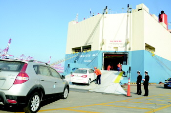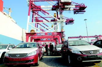 14日13时,一艘长189米、7层楼高的滚装外轮停靠在青岛保税港区联合集装箱码头U4泊位,码头上整齐停放的200辆国产东风轿车正等待装运。