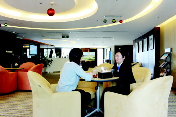 步入中国建设银行青岛分行的私人银行,不得不说,内部装饰相当考究,注意色调冷暖的搭配,油画纵横不一地挂在墙边,为私人银行中增添了不少的文艺气息。不论是多冷的天,客户进门入座后都会被奉上一杯热茶,在茶香中品味建行的私人银行文化。