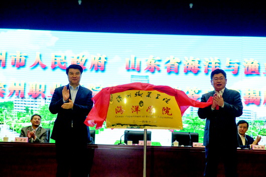 14日上午,滨州市人民政府和省海洋与渔业厅在滨州职业学院举行共建滨州职业学院海洋学院签字及揭牌仪式。市委副书记、市长崔洪刚(左),省海洋与渔业厅厅长王守信为滨州职业学院海洋学院揭牌,双方签署了滨州职业学院海洋学院共建协议。