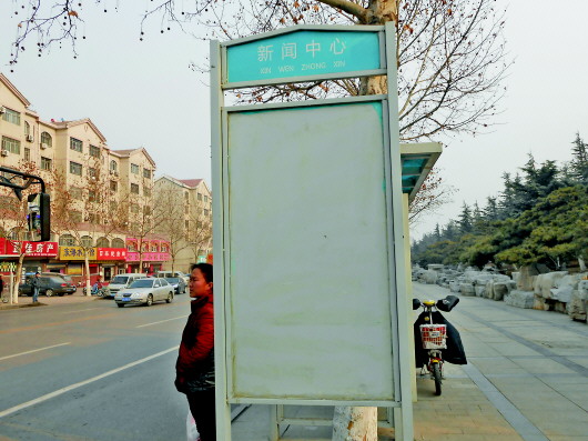 公交“新闻中心”站牌上的线路图被撕得一干二净。