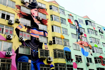 15日,在台东步行街附近的居民楼上,一些穿着时尚、略显暴露的美女墙绘风格前卫。据介绍,这些巨幅墙绘是台东步行街管委会的策划,最大的墙绘有21米高,意在粉饰周边的破旧老楼,打造手工彩绘一条街。