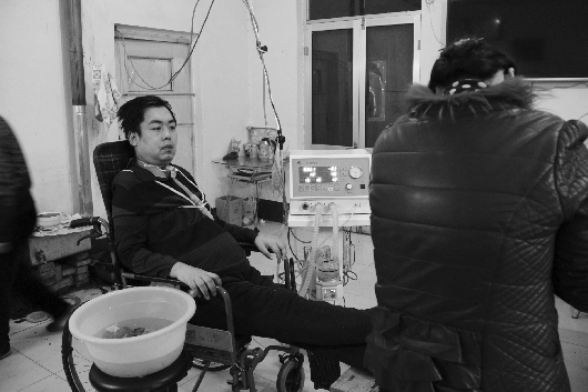 躺在轮椅上,连着呼吸机,每说一句话都显得很吃力的王伟,在交谈过程中,努力想要表达着自己的想法。同时,虽然王伟自己不能行动,但是他是有感觉的,每隔10分钟左右,就要人帮忙翻一次身。
