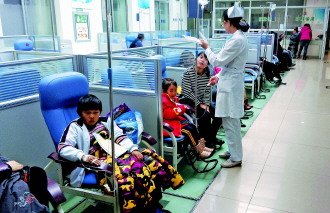 15日,在多家医院的输液室内,不少儿童在此打点滴。近期的气温较常年同期偏高,空气干燥,易滋生病菌,病毒性感冒高发。