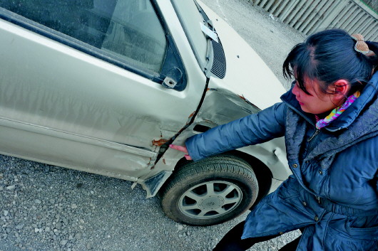 ◥李女士查看自己车辆的受损情况。