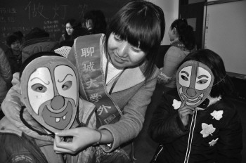 1月20日,聊城大学外国语学院“百灵鸟青年志愿者”来到聊城市特殊教育学校,与这里的孩子们进行心与心之间的交流。志愿者带领着孩子们学习制作传统小灯笼和趣味风铃,还带来了精心制作的面具,希望孩子们时时刻刻拥有灿烂的笑脸,并为孩子们送上本子、笔、书籍等学习用具。图为志愿者王美燕给孩子戴上制作的卡通面具。 本报记者 李军 通讯员 赵玉国 丁文杰 摄