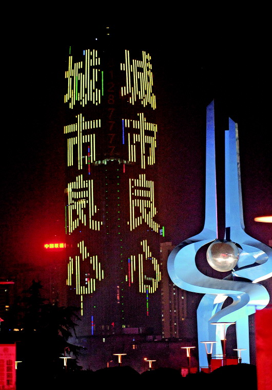 ▲从19日晚间开始,济南“第一高”绿地中心主大屏亮出“城市良心,责任市民,齐鲁晚报倾情奉献”等文字,为本报第三届责任市民暨最佳公共服务奖获得者亮灯。漂亮的灯光秀吸引了很多市民争相拍照并上传网络。