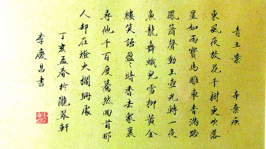 李庆昌自幼酷爱书画,特别是近十年来,把功夫下在继承传统临帖读帖上,并努力提高自己的艺术修养,先后反复临习古人楷、隶、行、小楷名碑名帖数十种。并坚持取法乎上,上追晋唐、行宗二王,对《圣教序》、《兰亭序》、《勤礼碑》、《黄庭经》、《乐毅论》、《灵飞经》汉隶等书帖下功夫尤深。坚持临书,近年来书艺不断提高。特别是经著名书法家张仲亭先生的精心指教,书艺进步更快。书法作品受到广大书法爱好者和专家学者的欢迎和好评。多次入选重大国际、国内书画大展并获奖。作品收入《新世纪第一春——全国企业界书画大展》、《第二届美术、书法作品集》、《中国当代书画艺术精英墨迹精赏》书画集。小楷作品被经济日报社收藏并多次在全国及省重大书法大赛中获奖。2003年为在书法上有更大的造诣,在北京参加了中国书法家协会书法培训中心的研修班学习,并得到著名书法家欧阳中石、沈鹏、刘艺、林岫等导师的亲授。并由指导教师著名书法家方传鑫先生定期指导,书法理论和技艺都提高很大。自己在书法艺术研究上将不断提高艺术修养,努力奋发与时俱进,创作出更好的作品回报社会。