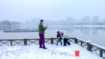 24日的一场小雪,市区空气质量明显好转。25日适逢周末,在一些景区,大人和孩子在玩雪。 本报记者 徐良 摄