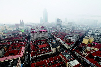25日,雨雾天气持续了一天,俯瞰西部老城区,能见度并不高。 本报记者 张晓鹏 实习生 张浩 摄