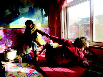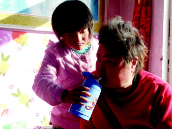 小路斐在村里的小学读二年级,每天中午放学后,她就要飞奔回家。进屋后,小路斐放下书包,就赶紧将电饭煲通电打开,里面是爸爸早晨出门前做好的饭菜。几分钟后,饭菜热了。小路斐爬上床,用尽力气拉着妈妈的胳膊帮她坐起来。