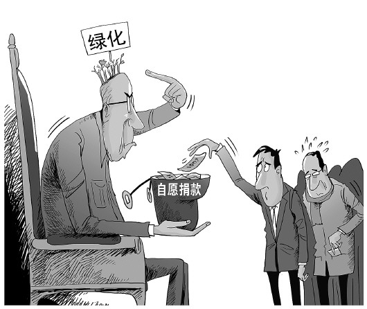 据澎湃新闻网报道,去年年底,濮阳市发出倡议书,呼吁社会各界为濮阳市城乡一体化示范区水库和龙山绿化“奉献力量”。在下辖的台前县里,这份倡议变成了以县政府办名义下发通知的行政指令性捐款。在各单位领导带头之下,普通职工也只能“自愿”捐款。 漫画/张建辉