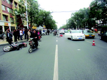 2013年10月18日14时许,新泰市青云路中段发生一起交通事故,一辆白色电动车倒在地上,不远处一辆白色车号为鲁J3E***的轿车右侧有刮擦和碰撞痕迹,前方10米处还倒着一辆无牌摩托车,地上有撞碎的散落物。