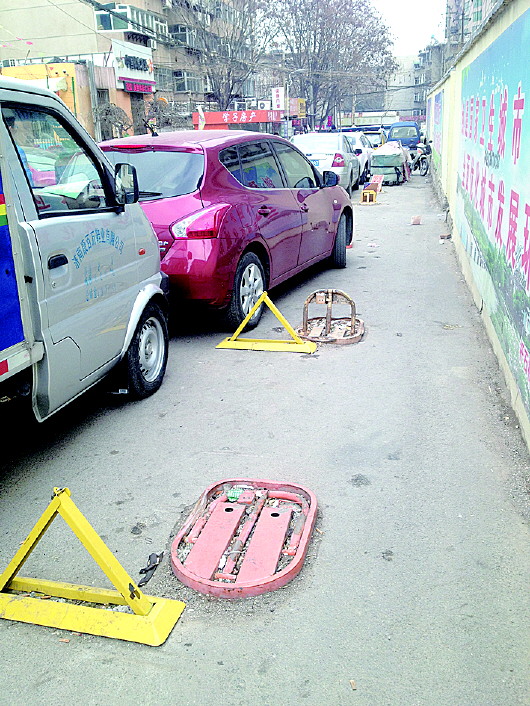 这条路的中间就是济南市房产管理局幼儿园,幼儿园门前也停有车辆。有位小学生在路上玩耍,一不小心,差点被三角形的停车锁绊倒。此外,还有人在停车锁上做起了生意。有的停车锁上立着牌子,上面写着“放车请留电话”。