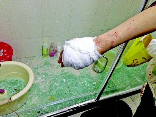 28日晚8点半左右,张女士刚刚洗完澡,准备推浴室的玻璃门时,玻璃却突然碎裂了。“当时只听‘哐当’一声,玻璃门整个全碎了,小碎玻璃碴子掉了我一身。我当时整个人都蒙了,等我反应过来时,右手被划了两条两三厘米长的深口子,还外翻着,血往外冒个不停。胳膊和腿上也有不少伤痕。我当时低着头,耳朵也受了伤。”提起昨晚的事儿,张女士仍心有余悸。