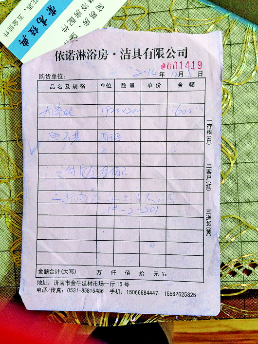 张女士购买浴室玻璃门的收据。