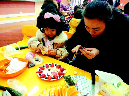 本报1月29日讯 “水果拼盘大赛现在开始!”随着一声令下,家长们各显神通、精雕细作,孩子们忙前忙后,不亦乐乎,你削皮,我装点,其乐融融。28日下午,长清区第三实验幼儿园的多功能活动室里举行小一班“果色飘香”水果拼盘比赛。