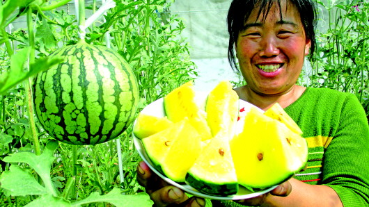 瓜农展示正宗的仁风富硒西瓜。(资料片)