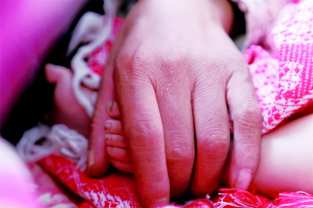 “这是一个绝症晚期患者,拍摄这组照片时,疼痛已经让她看不到、听不到了,而她能感受到。她还是一个1岁多孩子的妈妈,她的手无意中碰到了孩子的脚,她的手开始在周围摸索,她终于握住了孩子的小脚丫……”当摄影记者韩逸说起这幅被命名为《大手握小脚》的照片背后的故事时,布展现场的人都沉默了。