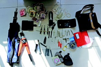 泊于边防派出所民警赶到现场控制住男子,当场搜出一把液压钢筋钳和四套开锁工具,还搜出了现金、钱包等物品。经查,男子咸某是临沂人,目前无正当职业。28日上午,咸某带着开锁工具乘车到泊于镇某村,发现一村民家无人,便进入院子,用液压钢筋钳撬开四房门入室盗窃。咸某被刑事拘留。