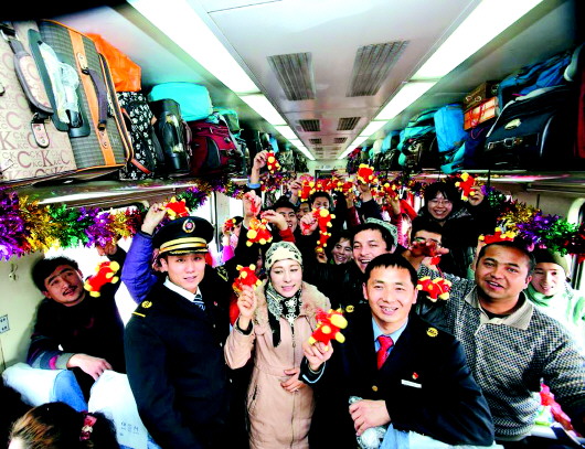 春运期间,济南客运段济南开往新疆的列车上,列车长荣金升和列车员赵侦峰与车上的少数民族旅客一起,共同迎接新春佳节的到来。