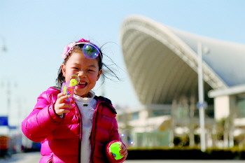 1日下午,天气晴朗,阳光明媚,一个孩子在火车站北广场吹泡泡,十分开心。 本报记者 韩逸 摄