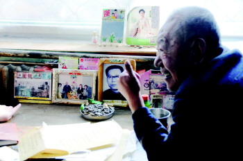 在敬老院居住的齐大爷,桌子上摆满家人的照片,津津乐道地谈论着照片里的故事。 本报记者 马志勇 摄