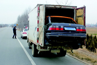本报3月1日讯(记者 王震) 1日早晨,在202省道文登小观镇路段,一司机驾厢式货车拉载一辆报废轿车,轿车后尾部露在外面,超长运输。经查,厢式货车还无保险、无年审。