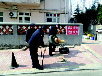 2日上午,在徐州路53号院内,市南城管香港中路中队拆除了35处私设地锁。该院内部分居民使用废旧轮套、锥形帽等物品私设地锁占车位,院内的老人和孩子经过时常有绊倒摔伤的情况发生。