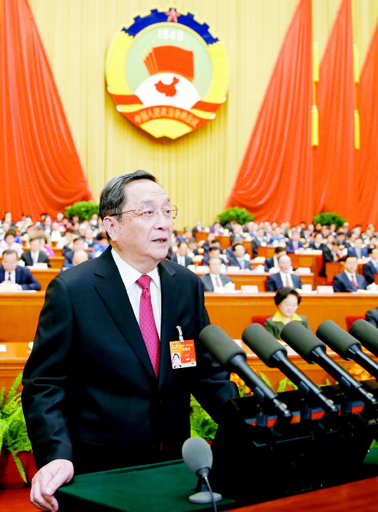 俞正声代表政协第十二届全国委员会常务委员会,向大会报告工作。