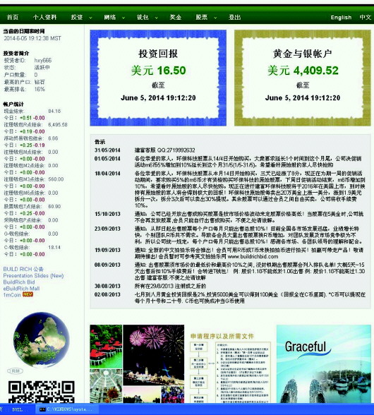 网络传销的网站截图。虽然账户上显示有回报,却无法提现。