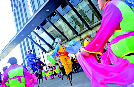 3日,在大众传媒大厦广场上,东舍坊高跷队的成员表演了“八仙过海”、“西游记”、“叠罗汉”等系列节目,为市民送上节日的祝福和欢乐,各种惊险的动作让观众连连叫绝。 本报记者 王媛 许建立 摄影报道