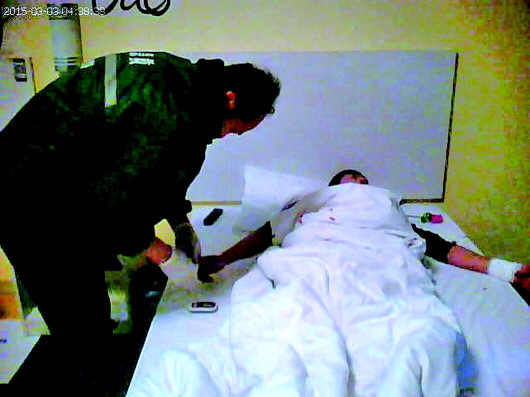 凌晨4时20分,民警和晓文赶到该宾馆,让宾馆工作人员打开陈某所住的房间。眼前的一幕让大家触目惊心,陈某躺在床上,右手放在额头上,左手手腕耷拉在床边,血流不止。陈某陷入了半昏迷状态,地上已经有了一摊血,血迹斑斑的被子上放着一把刮胡刀。