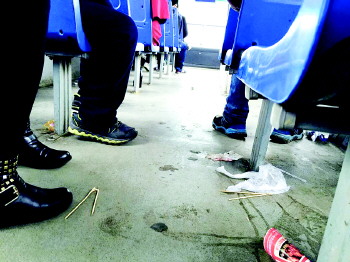 19路公交车上,乘客随手扔竹签。本报记者 康宇 摄