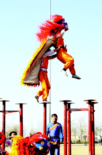 高桩上轻盈的舞狮表演。