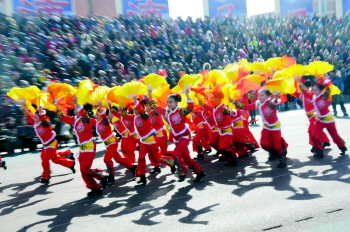 3月3日上午,德州市2015年元宵节民间文艺展演活动在市中心广场热闹开演。与往年相比,今年的元宵节文艺演出重在突出地方民间特色,跑驴、水兽旱船、弹鼓舞、抬花杠等非物质文化遗产轮番上演。展演中,200余名小学生带来的跑驴、水兽旱船等表演引围观,德州“非遗”后继有人。