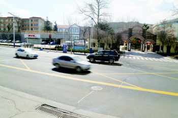 4日,烟台一中门口的网格禁停线已经画好,黄线内一律禁止停车。 本报记者 韩逸 摄