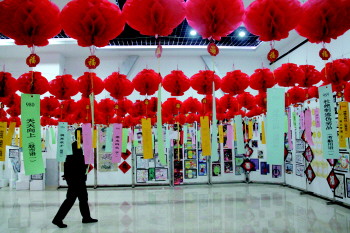5日下午,记者来到菏泽市图书馆一楼展厅时,门口已排起长长的队伍。展厅内1000余个红色的灯笼下面悬挂着用彩纸写成的迷面,将展厅装扮得十分喜庆。“灯谜涵盖地名、历史人物、名胜古迹等题材,为了方便年纪小的孩子能够看到迷面,够到迷面纸,特别将灯笼挂得低些。”菏泽市图书馆副馆长张伟胜说。