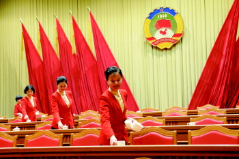 一走进会议中心一楼大会堂,主席台前除了树立的话筒,并没有其他摆置。几位工作人员正在摆放茶杯,整个会场以单一的红色调为主。