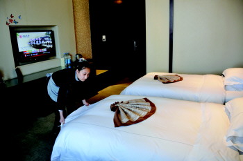 “为了显得温馨一点,我们的工作人员利用房间本身的毛巾和浴巾折了一些小动物,利用一些废旧物品手工制作鲜花,这些都是可以重复循环使用的,也节省了开支。”齐盛国际宾馆房务部主管于海峰介绍。