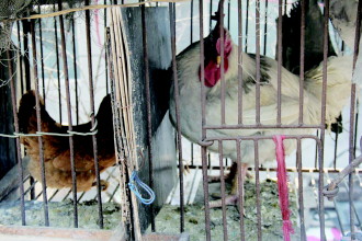 这只巨型鸡的鸡笼被隔开了两个空间,李先生表示是防止这只巨型鸡“欺负”旁边的母鸡。“别看它现在不动,要是哪只鸡到了它的地盘它就会用嘴还击,很是厉害。”李先生打算把巨型鸡拿出来让记者仔细观察,费了一番工夫之后,他确信这只鸡已经不能从笼口出来了,只能把铁条弄断才能出来。在试图把巨型鸡弄出来的过程中,这只鸡受到了惊吓,站立了起来。