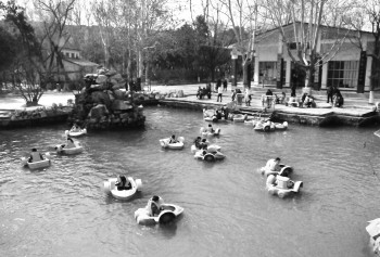 3月7日,聊城人民公园里不少游客带着孩子在湖里坐游船。据了解,最近天气暖和,湖面上的游船也多了起来。 本报记者 邹俊美 摄
