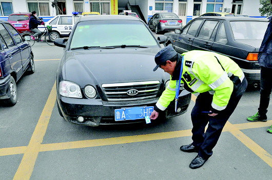 9日上午10点半,历城交警大队工北中队民警在工业北路电建路查处了一辆涉嫌变造号牌的黑色起亚轿车。经讯问,驾驶员刘某承认,为躲避抓拍处罚,从网上买了号码磁铁“6”粘贴在号码H上,将自己的车牌号鲁A×××HF,变造为鲁A×××6F。民警依法对刘某处以2000元罚款,记12分的处罚。 本报记者 张泰来 通讯员 尹婷婷 摄影报道