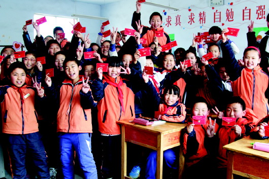 同学们迫不及待地展示收到的红包。本报记者 张爽 摄