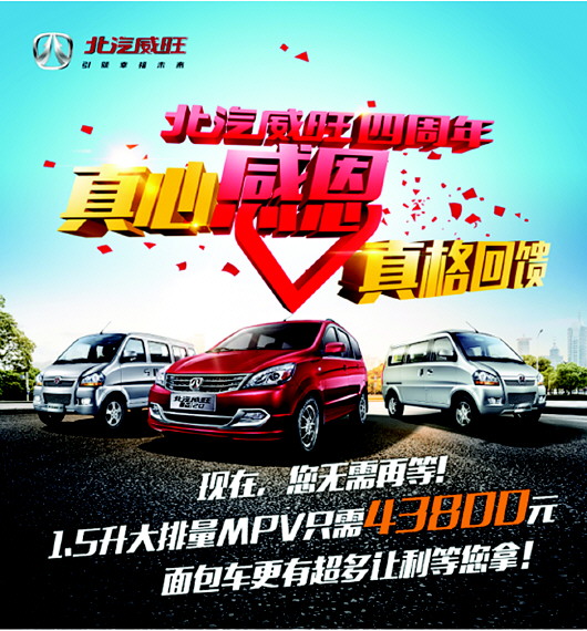 自2011年成立至今,北汽威旺已在微车市场走过整整四个年头。凭借“实力威旺 北京质造”的品牌和产品优势,仅用了四年,北汽威旺就经历了“从无到有,从有到优,从优到精”的发展和蜕变,陆续推出“面霸”北汽威旺306,“空间王”北汽威旺205及205加长版,“国民车”北汽威旺 M20以及“实用王”北汽威旺307,实现了在微车领域四大细分市场的全面覆盖,夯实微车市场主流地位,强势进军微车品牌第一阵营,北汽威旺将是用户致富之路上的最佳伙伴。