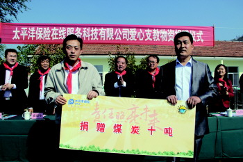 ▲太平洋保险在线公司党委书记、总经理俞斌向希望小学捐赠爱心煤炭10吨。