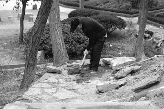 位于文化路与青檀路路口处的公园,施工人员正在进行整修。预计将于本周内完工,补植的灌木将让公园内的小山在春天到来时披上绿色。 本报记者 袁鹏 摄影报道