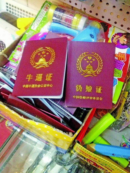 牛逼证、伪娘证……10日,记者在育英中学附近的一家文具店看到,在一堆彩笔和墨水瓶之间放着一大叠证书,只见朱红色的皮面上印刷着“牛逼证”三个金色大字,吸引了不少学生购买。“我们都买了送人的,过节的时候送得更多。”一名学生表示,这种证书很早就有了,学生之间相互买来送人,“就是为了好玩,还有好几种证,三块钱一个。”根据工商部门的规定,这种产品没有厂名、厂址,属三无产品,是不允许销售的。但这些证件类似于玩具,内容是否低俗不好界定,需要老师对学生进行教育。
