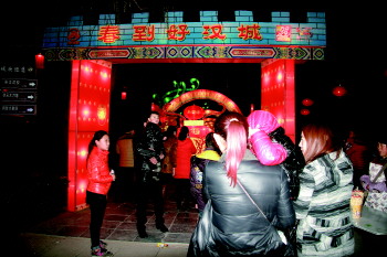 ◥春节期间众多游客前往好汉城赏灯。